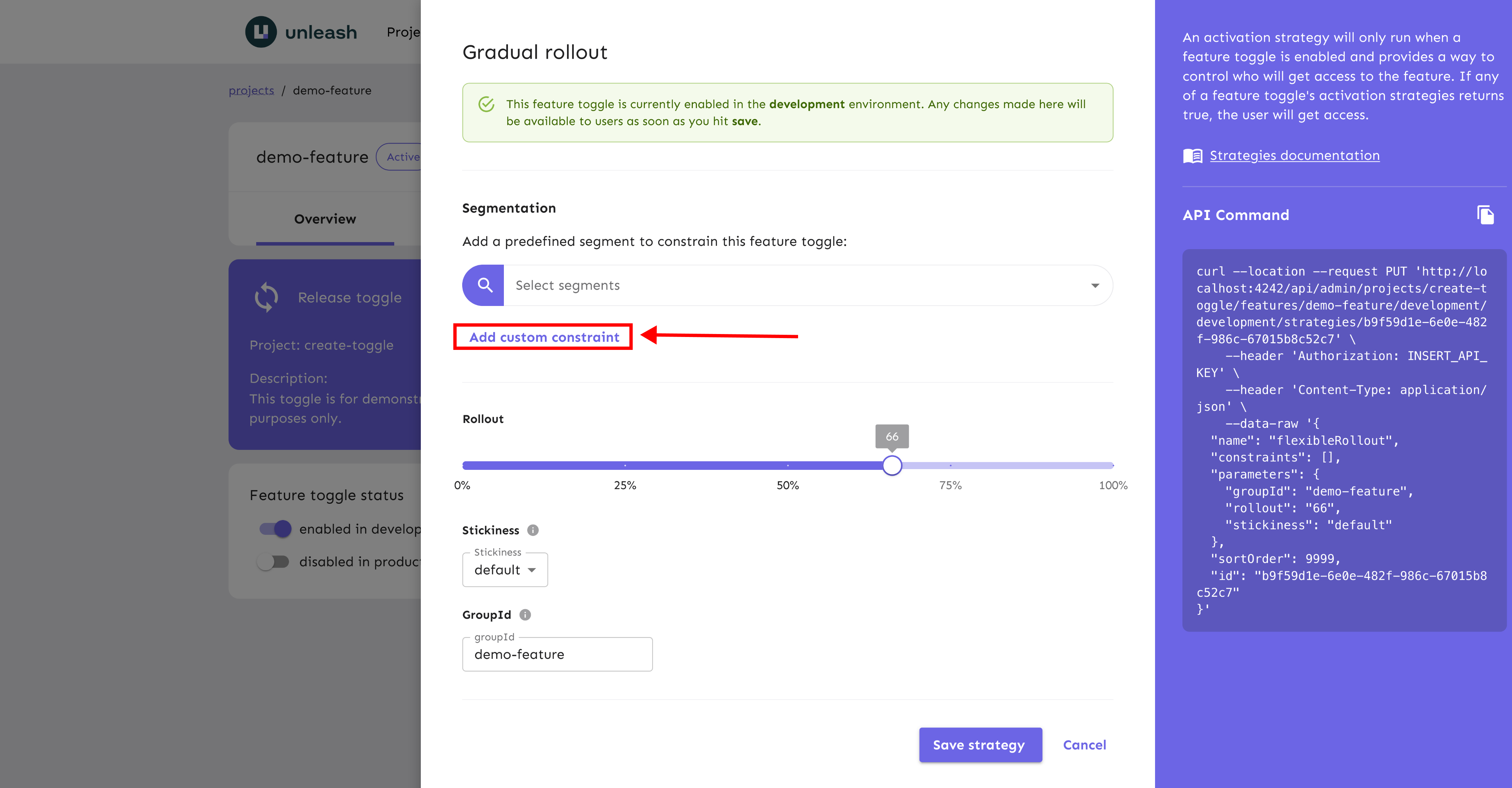 * Docs: write down the currently available steps * docs: quick updates to the projects page. * docs: further scaffold the how-to guide * docs: add feature-toggle.mdx (toggle reference doc) * docs: Add note that feature toggle names must be unique * docs: add API doc links * docs: delete old content * docs: delete old images * docs: update variants text * docs: update introduction * docs: add new images, update api annotations * docs: add links to context fields, improve link text for other links. * docs: remove redundant wording. * docs: fix default project for toggles * docs: typo: singular -> plural * docs: mention admin ui curl command * docs: remove leftover words * docs: improve linking to default project. * Apply suggestions from code review Co-authored-by: sighphyre <liquidwicked64@gmail.com> * Apply suggestions from code review Co-authored-by: sighphyre <liquidwicked64@gmail.com> * docs: clarify constraint timing * docs: apply suggestion from code review * docs: add link to variants document * docs: Add sections on environments and projects, link from ft docs * docs: minor rewording into unleash context. * docs: remove misleading section about "all strats evaluated" * docs: evaluate -> resolve Co-authored-by: sighphyre <liquidwicked64@gmail.com>