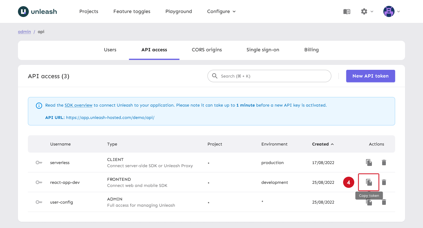 * refactor how-to guide for creating a token * fix token links * update SDK reference * beginning of direct api guide * refactored frontend api guide * lint staged breaking notes * update docs - cors for frontend * update token guide images * update after review * Apply suggestions from code review `website/docs/user_guide/token.mdx` Co-authored-by: Thomas Heartman <thomas@getunleash.ai> * Apply suggestions from code review `website/docs/topics/frontend-api.md` Co-authored-by: Thomas Heartman <thomas@getunleash.ai> * Apply suggestions from code review Co-authored-by: Thomas Heartman <thomas@getunleash.ai> * Apply suggestions from code review Co-authored-by: Thomas Heartman <thomas@getunleash.ai> * pr review * docs: Add info about front-end tokens + formatting * docs: add info about token anatomy * docs: link to correct place in doc * docs: replace "direct access API" -> "front-end API" * docs: rename file frontend-api -> front-end-api Co-authored-by: Thomas Heartman <thomas@getunleash.ai>